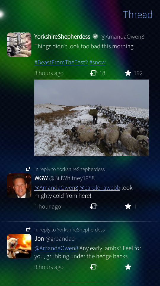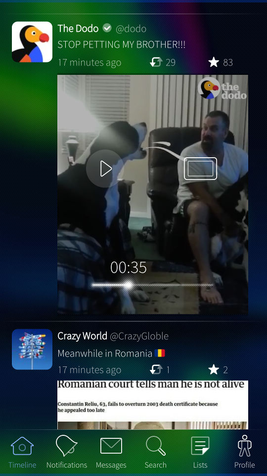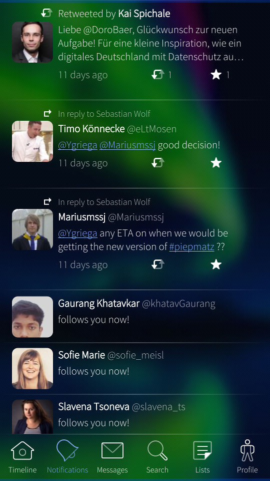 Piepmatz supports all the features of Twitter that you need to say up-to-date. Your personal timeline, notifications, media etc. - coming with a lot of eye-candy!